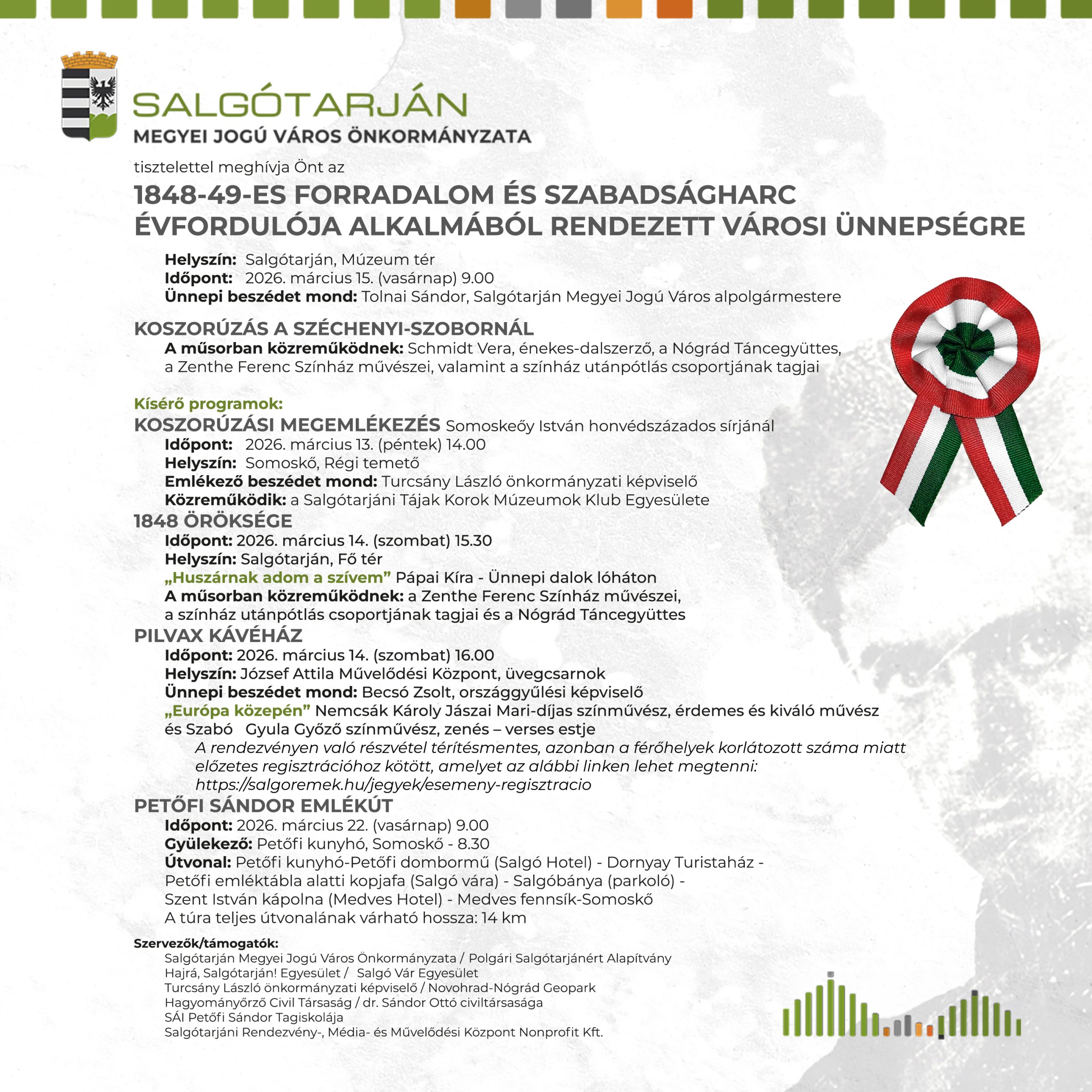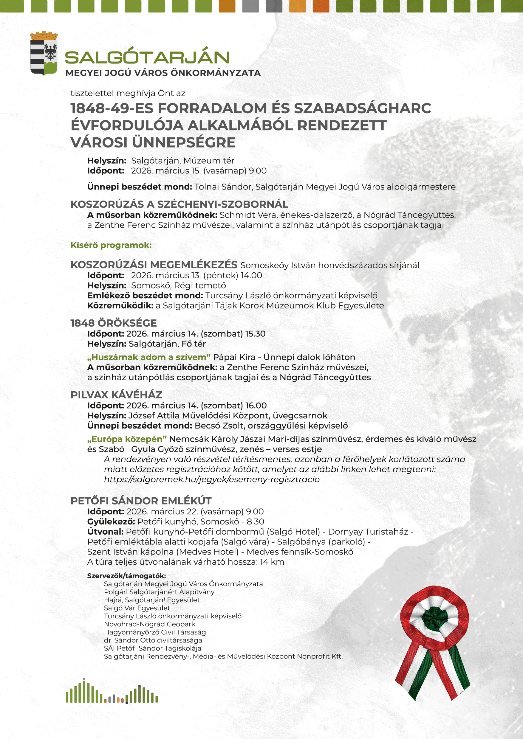 Városi programok az 1848-49-es forradalom és szabadságharc évfordulója alkalmából 2026-03-10 Szerző: salgotarjan.hu